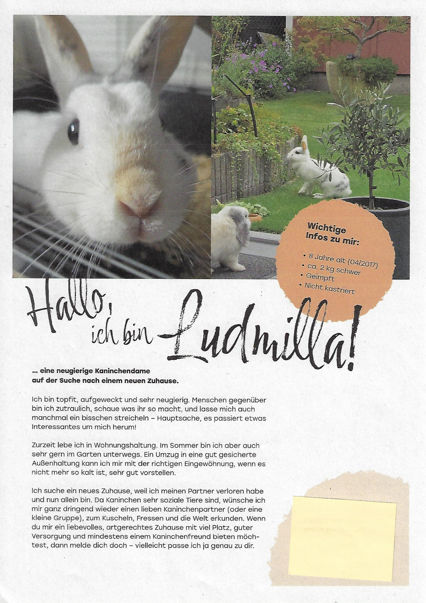 Ludmilla ist eine neugierige Kaninchendame auf der suche nach einem neuen Zuhause. Ihr Partner ist versorben und nun sucht sie einen neuen Gefährten. Sie ist im Moment in der Wohnungshaltung und kann nicht in ein Außengehege. Menschen gegenüber ist sie zutraulich und neugierig.
