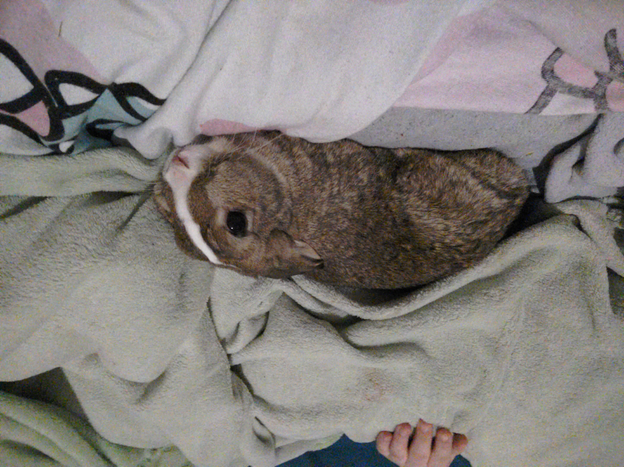 Die beiden sind Nachkommen eines Holländer-Zwergkaninchens, das schwanger an der Ruhr gefunden wurde. Der Vater von den beiden war ein Wildkaninchen. Wir hatten die Mutter vor neun Jahren adoptiert, einen Monat später kamen die Geschwister zur Welt.