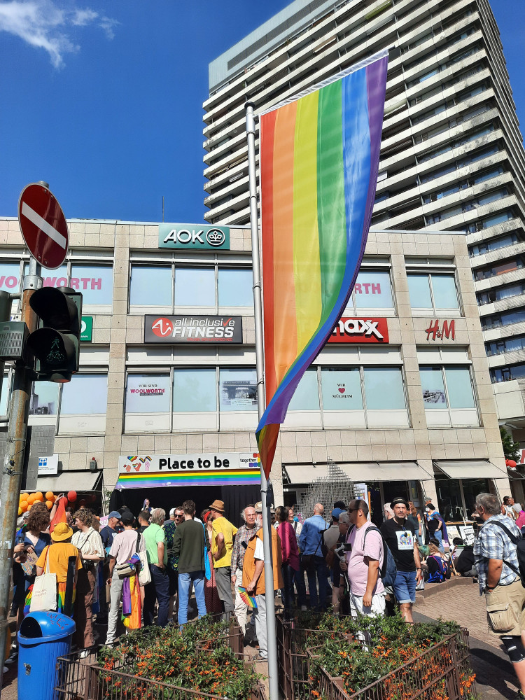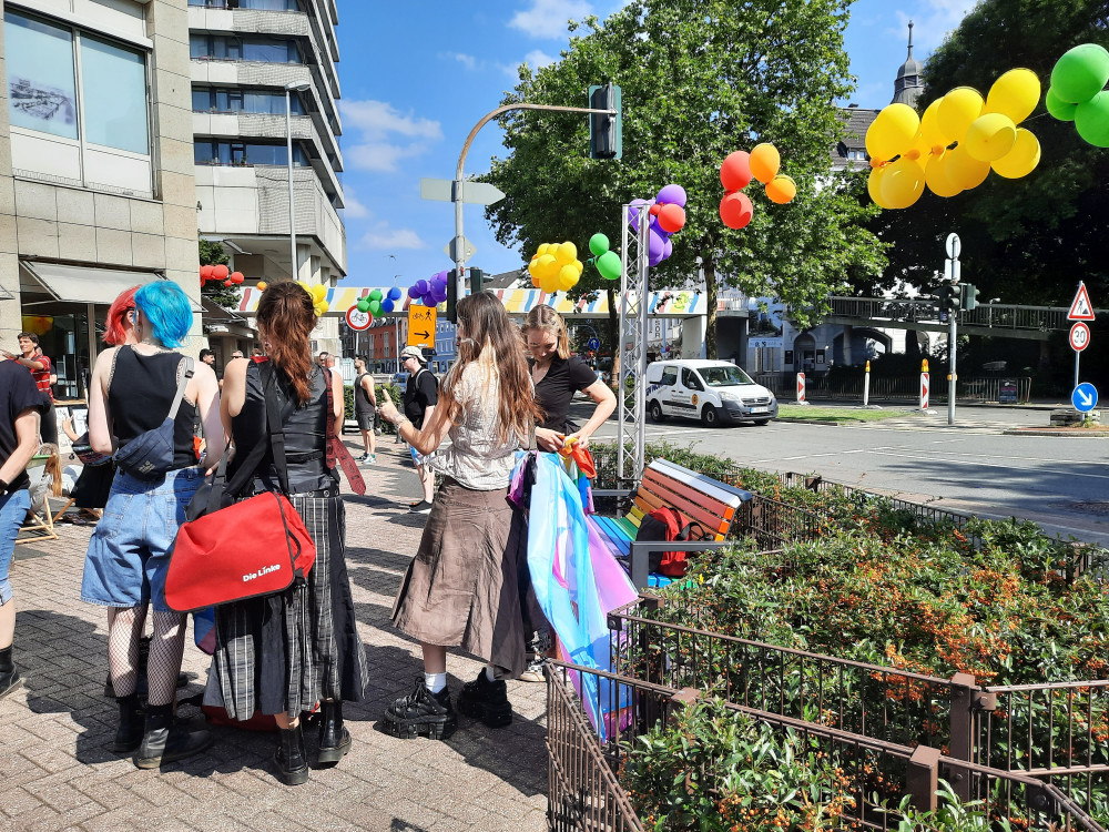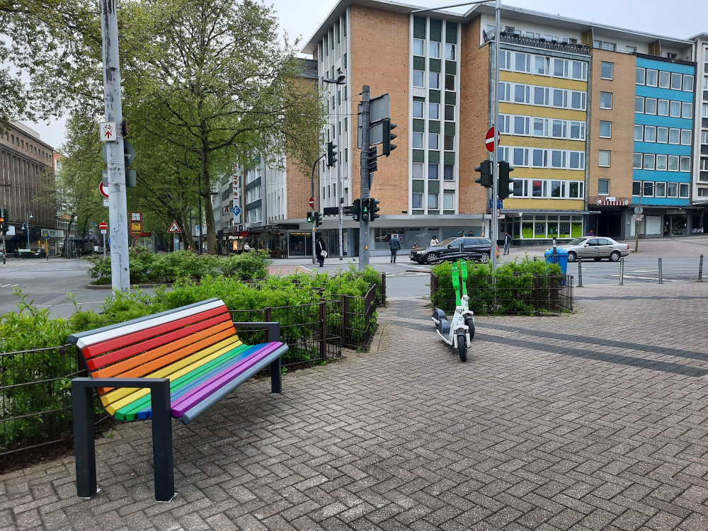 Die Sitzbank lädt Besucher*innen und Passant*innen zum Verweilen ein und zeigt gleichzeitig ein sichtbares Zeichen für Vielfalt und Akzeptanz. Der Fahnenmast sorgt dafür, dass die Regenbogenflagge auch aus der Ferne wahrgenommen wird. Durch diese Maßnahmen wird der Platz lebendiger und signalisiert Offenheit gegenüber allen Menschen. Die Umsetzung stärkt das Bewusstsein für gesellschaftliche Vielfalt in Mülheim. Mülheimer*innen können den Platz nun als Ort der Begegnung und Teilhabe nutzen. Das Projekt zeigt, wie kleine Maßnahmen das öffentliche Stadtbild bereichern und ein inklusives Zeichen setzen können.