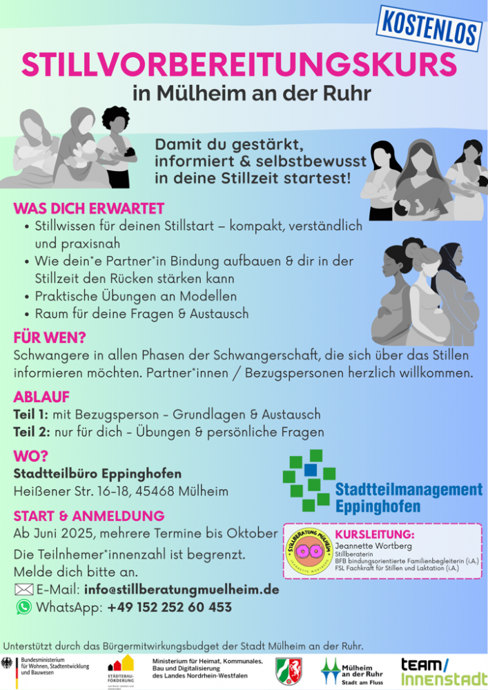 Von Mai bis Mitte Oktober 2025 fanden im Stadtteilmanagement Eppinghofen kostenfreie Stillvorbereitungskurse statt. Das Angebot von Stillberaterin Jeannette Wortberg richtete sich an werdende Eltern in Mülheim, besonders an Familien im Stadtteil Eppinghofen. In zwölf Terminen à drei Stunden lernten die Teilnehmenden, wie ein guter Stillstart gelingen kann und welche Unterstützung es dabei gibt. Der Kurs bot praktische Übungen, Raum für Austausch und beantwortete viele Fragen rund ums Stillen.