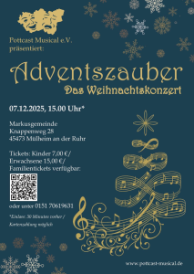 Der Pottcast Musical e.V. lädt am Sonntag, den 7. Dezember 2025, um 15:00 Uhr zu einem festlichen Konzert in die Markusgemeinde, Knappenweg 28, 45473 Mülheim an der Ruhr, ein. Unter dem Titel „Adventszauber – Das Weihnachtskonzert“ erwartet die Besucher ein stimmungsvoller Nachmittag voller Musik, Emotion und weihnachtlicher Atmosphäre.