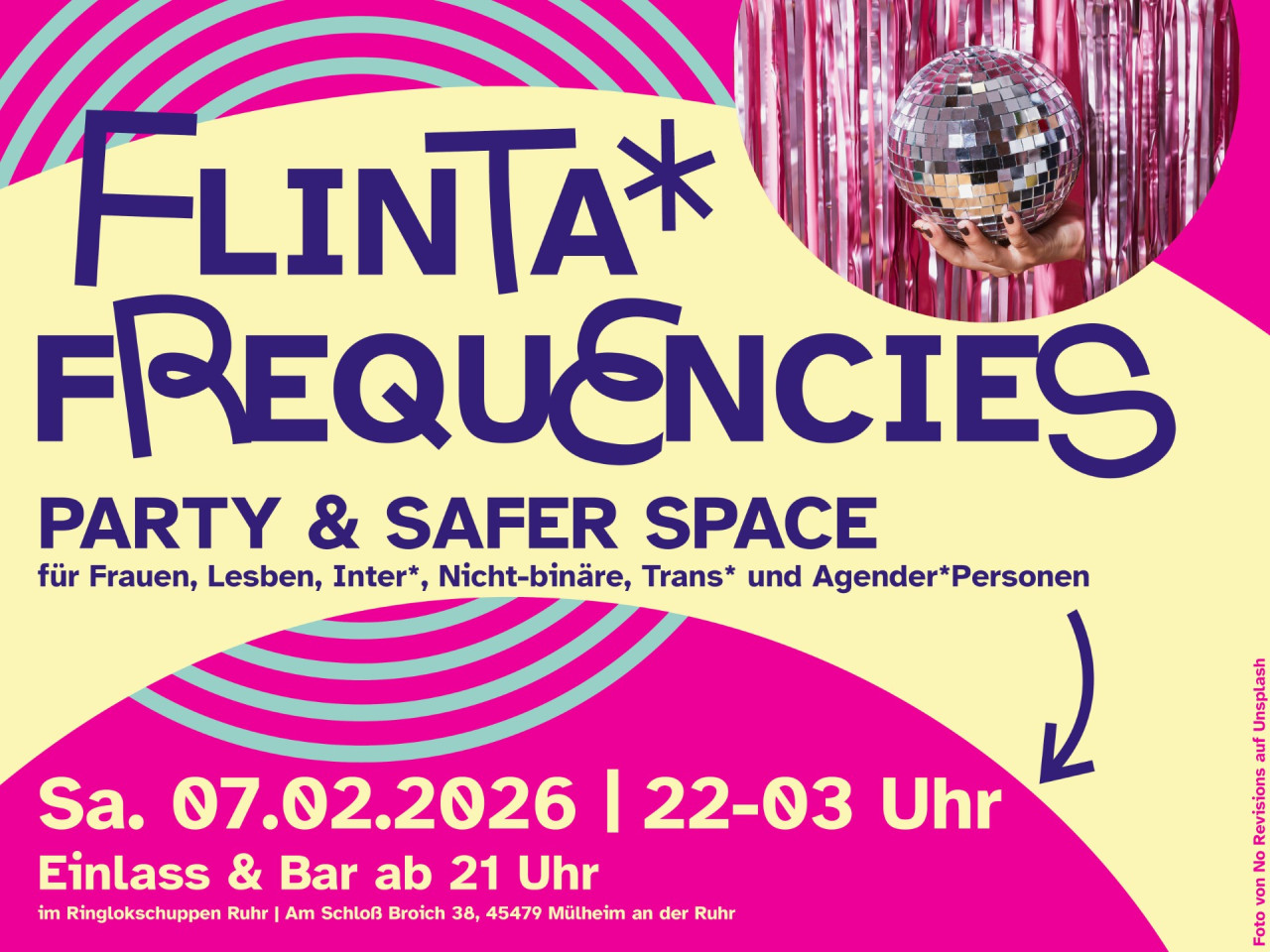 FLINTA* steht für Frauen, lesbische, Inter, nichtbinäre, trans und agender Personen. Das Sternchen steht für alle weiteren Geschlechtsidentitäten, die nicht cis männlich sind, d.h. Männer, deren Geschlechtsidentität mit dem Geburtsgeschlecht übereinstimmt. Da Geschlechtsidentität nicht am Äußeren abzulesen ist, bekommen alle Gäste beim Einlass eine kurze Einführung, um was für eine Party es sich handelt.