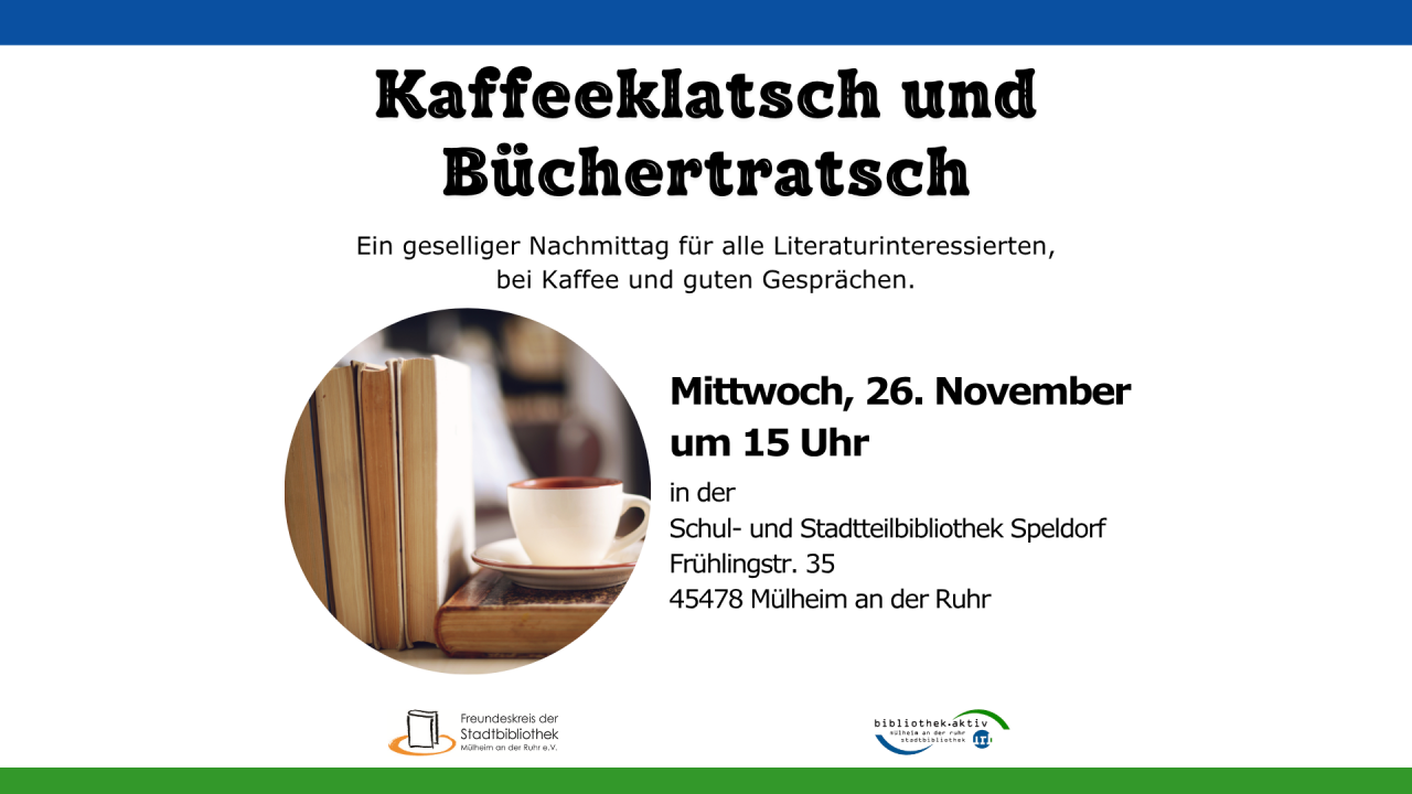 Kaffeeklatsch und Büchertratsch Ein geselliger Nachmittag für alle Literaturinteressierten Bei einer Tasse Kaffee über Bücher plaudern, neue Lesetipps entdecken und sich mit Gleichgesinnten austauschen – dazu laden wir herzlich ein! Wann: Mittwoch, 26. November, um 15 Uhr Wo: Schul- und Stadtteilbibliothek Speldorf Frühlingstraße 35, 45478 Mülheim an der Ruhr Wir freuen uns auf einen gemütlichen Nachmittag voller guter Gespräche und Lesefreude! Wir bitte um Anmeldung: Telefon: 0208 / 588 4830 E-Mail: ZW-Speldorf@muelheim-ruhr.de oder direkt vor Ort in der Schul- und Stadtteilbibliothek Speldorf