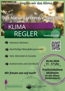 "Heimisch gärtnern, nachhaltige Manufakturprodukte, soziale Themen, leckeres Essen und Live-Musik: Das Klimaregler-Festival auf der großen Wiese im Dimbeckpark passt perfekt ins Frühjahr. Am Sonntag, 26. April bittet die Regionalgruppe Rhein-Ruhr des Vereins Naturgarten zur vierten Festival-Auflage, die auch in diesem Jahr von den Reglern unterstützt wird." (WAZ/NRZ vom 27.01.2026)