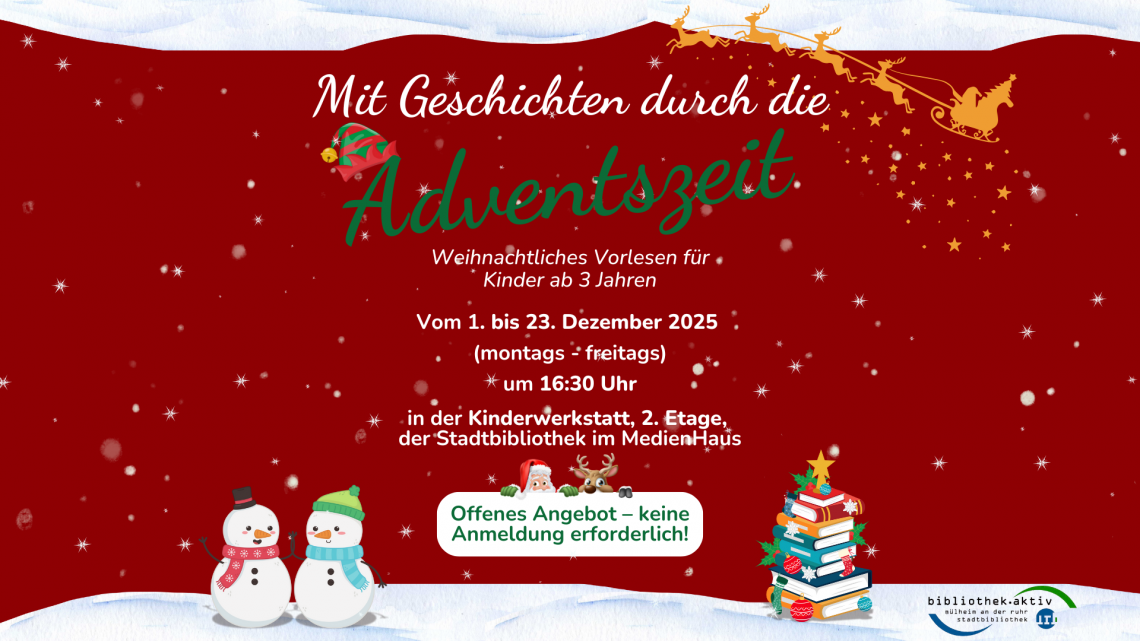 Vom 1. bis 23. Dezember 2025, immer montags bis freitags um 16:30 Uhr, laden wir alle Kinder ab 3 Jahren herzlich zum weihnachtlichen Vorlesen ein.