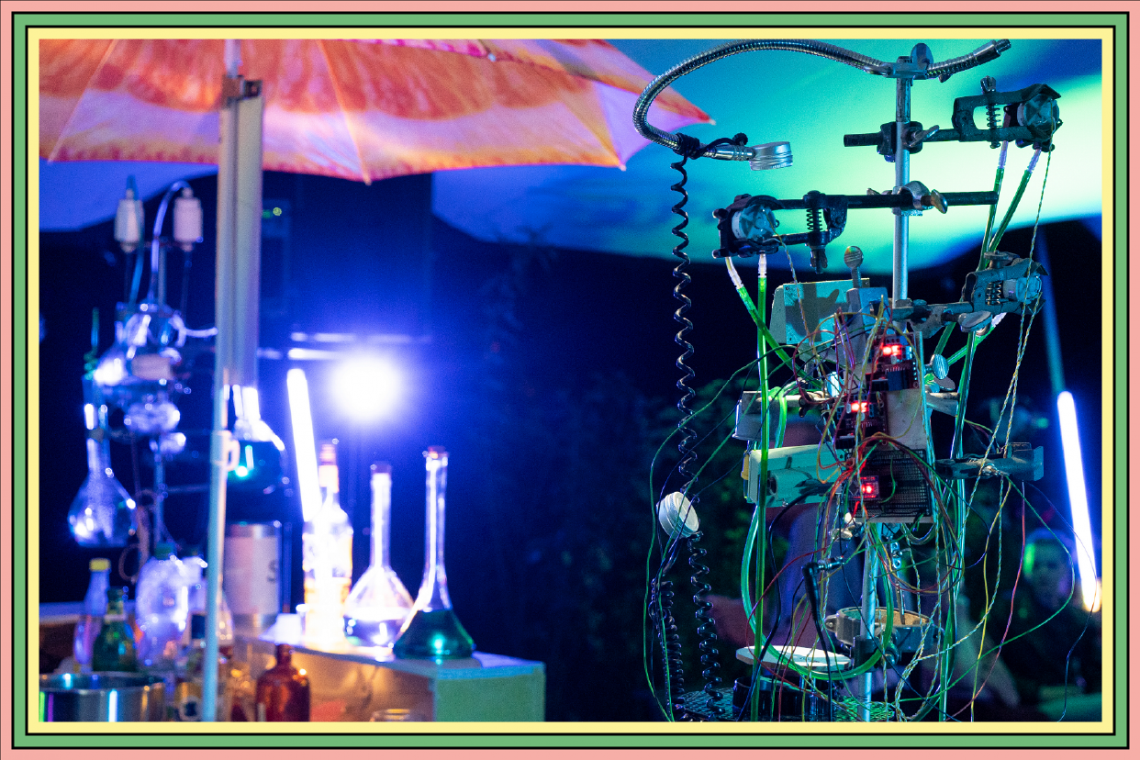 Inmitten der dunklen Jahreszeit öffnet die Laborküche Nuklear Nektar zu oszillierenden Klängen ihren projizierten Schirm. Was auf den ersten Blick wie ein schlichter Ausschank erscheinen mag, entpuppt sich mit Einbruch der Dunkelheit als verdichteter Raum aus Licht und mäandernden Schatten. Die immersive Installation mit ihren skulpturalen Artefakten lädt zum Verweilen und gemeinschaftlicher Erkundung ein. Aus sorgfältig präparierten Glaskolben und vernebelten Destillen gemischte Getränke – zubereitet aus unbekannten Essenzen und zähflüssigen Tropfen – verlocken zum zufälligen Gespräch, zur Begegnung. Die Laborküche versteht sich als temporäre Versuchsanordnung, in der das Alltägliche unterwandert wird. Im Laufe der Nacht kann sie zum Schmelztiegel, zum Resonanzraum zwischen Rhythmus und Reflexion werden. Nuklear Nektar ist nur an bestimmten Tagen vollständig geöffnet.