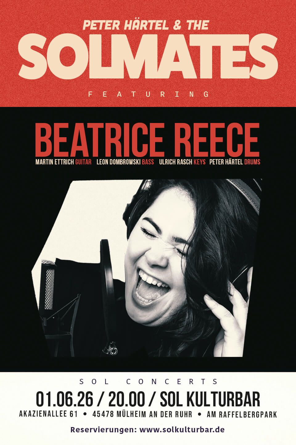 Am 1. Juni ist Peter Härtel & the SOLMATES feat. Beatrice Reece in der SOL Kulturbar live zu erleben. Mit Beatrice Reece präsentiert die Reihe bewusst ein neues Gesicht auf der Sol Bühne, eine Künstlerin mit großer stilistischer Bandbreite und ausgeprägter Bühnenpräsenz.