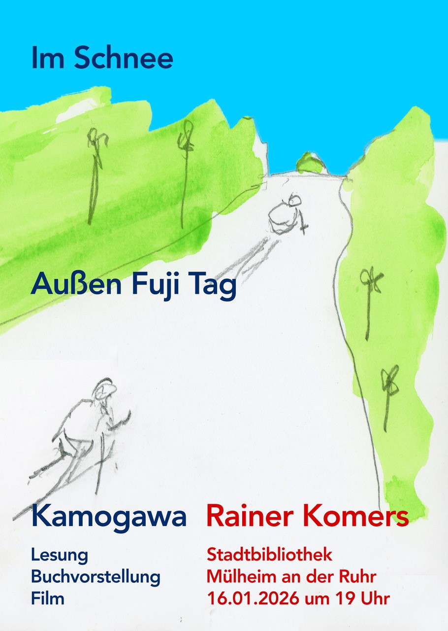 Vorgestellt werden die Erzählung „Im Schnee“, die Monografie „Außen Fuji Tag“ sowie der Film „Kamogawa“. Der Abend bietet Einblicke in das literarische und filmische Werk Rainer Komers.