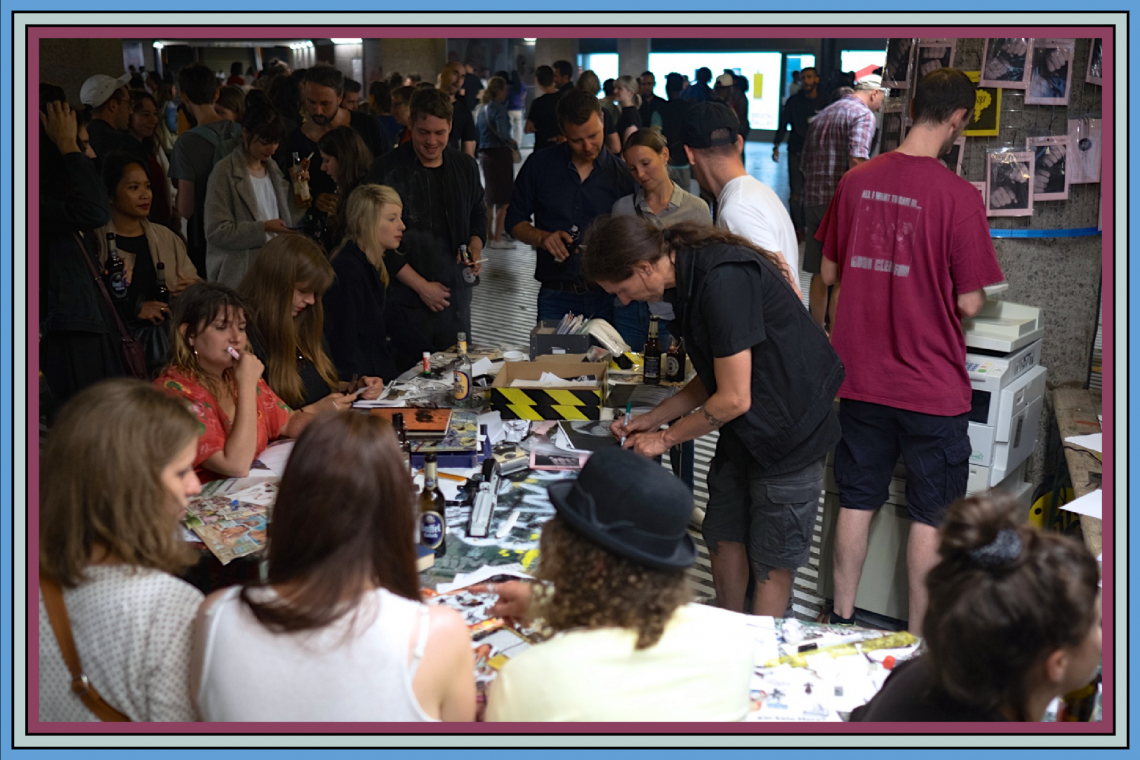 Ein Theaterfoyer voller Menschen, ein paar Getränke... dein Hirn trifft den Kopierer – und bastelt utopische Publikationen! Der Fotokopierer spuckt alle paar Sekunden dein Bild, deinen Text und tropfenden Schweiß aus. Nico Bergmann und Torben Röse greifen auf, tackern zusammen und bringen eure Gedanken in Guss. Eine Form, ein Zine – ein kleines, selbstgemachtes Magazin – im Fünfminutentakt, das Werk Gottes oder einfach ein Haufen Grütze. Beides ist gut!