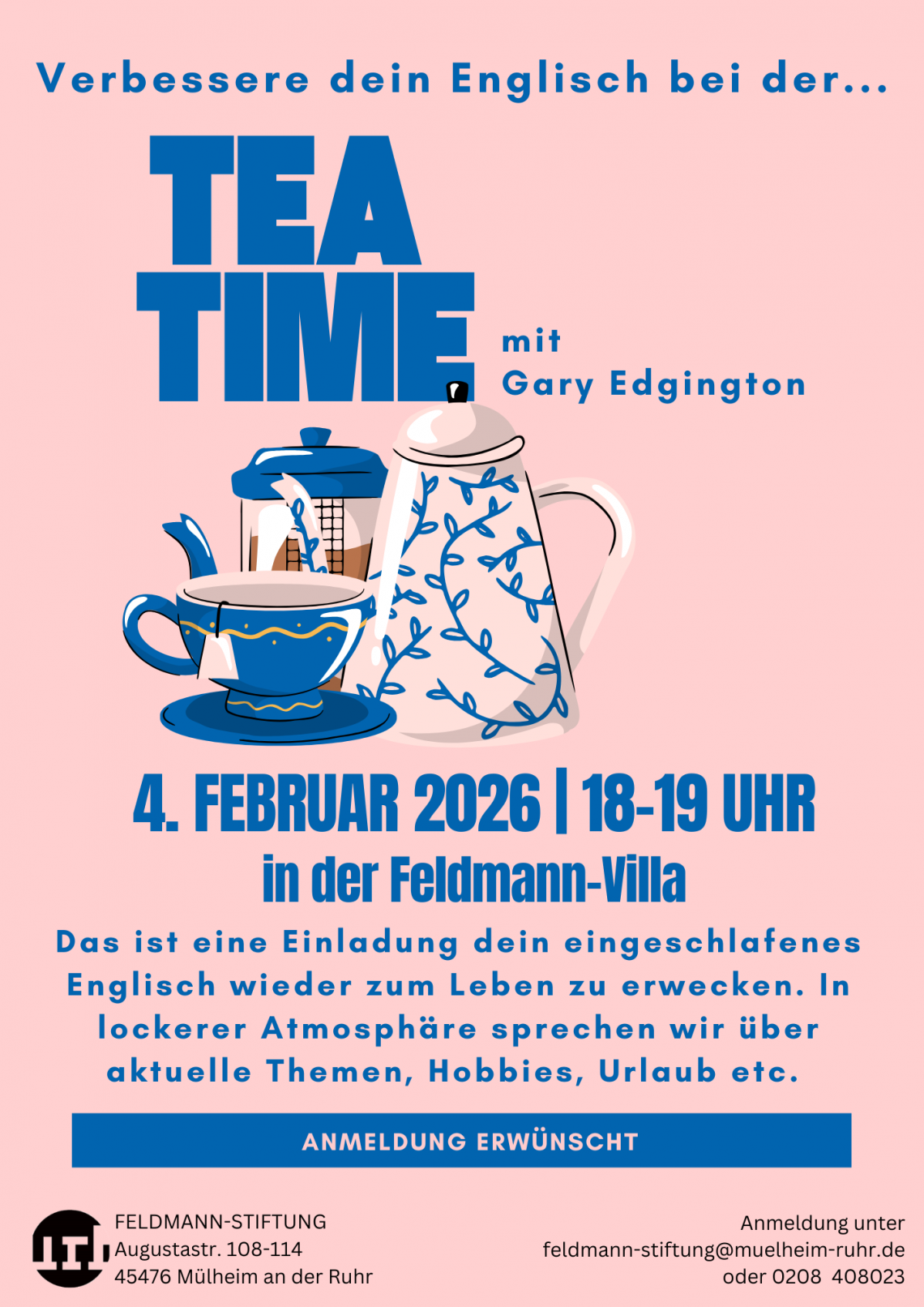 Bei "Tea Time: Good Talks" kannst du bei Tee zwanglos dein Englisch verbessern. Wir unterhalten uns über alles Mögliche von Alltagsthemen bis zu deinen Interessen, ganz ohne Lehrplan. Perfekt um deine Kommunikationsfähigkeit zu verbessern und gleichzeitig nette Leute kennenlernen Gleitet wird die Stunde von einem Nativ Speaker, gewisse Englischkenntnisse sind erforderlich, eine Anmeldung wird erwünscht unter feldmann-stiftung@muelheim-ruhr.de oder 0208 408023