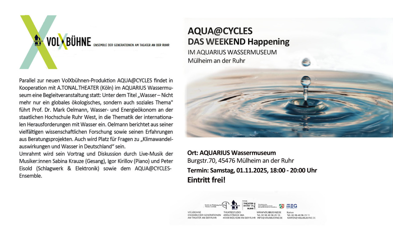 Mit AQUA@CYCLES untersuchen das renommierte Theater an der Ruhr mit der VolXbühne und das A.TONAL.THEATER das Element Wasser auf seine Analogien zu unserem Leben, zu persönlichen Situationen und aktuellen wie zukünftigen gesellschaftspolitischen Fragestellungen. Denken wir an WASSER so reicht die Bandbreite der Assoziationen weit – von der persönlichsten aller Erfahrungen mit dem Fruchtwasser als Embryo im Mutterleib über das Meer als Sehnsuchtsort und Schauplatz schwerer Unglücke oder die Erfahrung mit überlaufenden Flüssen als Lebensbedrohung bis hin zu wissenschaftlichen und politischen Fragen des Klimawandels, dem Wassermangel und den daraus folgenden Migrationswellen.
