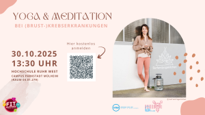 Anmeldung: https://www.hochschule-ruhr-west.de/die-hrw/wir-leben-vielfalt/gesundheit-hrw/impulsvortrag-und-yogaworkshop-yoga-meditation-und-brust-krebserkrankungen-mit-jaqueline-reske-fuer-alle-hrw